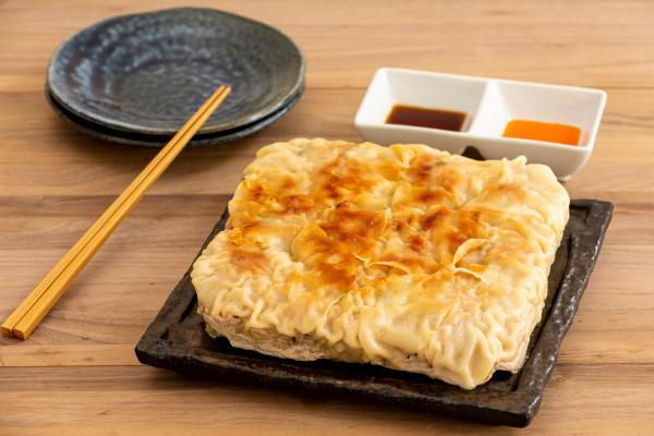 餃子の皮をフライパンにしき、肉あんと餃子の皮を重ねラザニアのように焼くと、見た目はラザニア、食べると餃子!四角い形がかわいいレシピです。