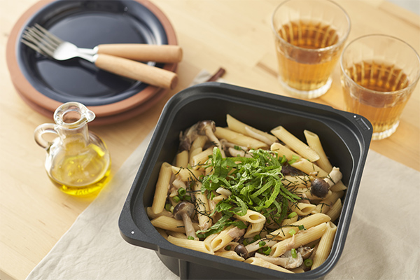 ツナとキノコをバター醤油で味付けした、和風ワンポットパスタです。仕上げにネギや大葉、海苔などをトッピングして彩りと風味をプラスします。