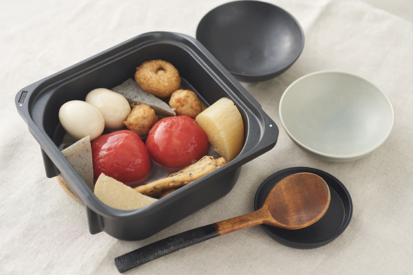 いつものおでんに湯むきしたトマトを丸ごと入れた、洋風おでんです。トマトの酸味がかつお出汁に染み出て新しい美味しさを作ります。